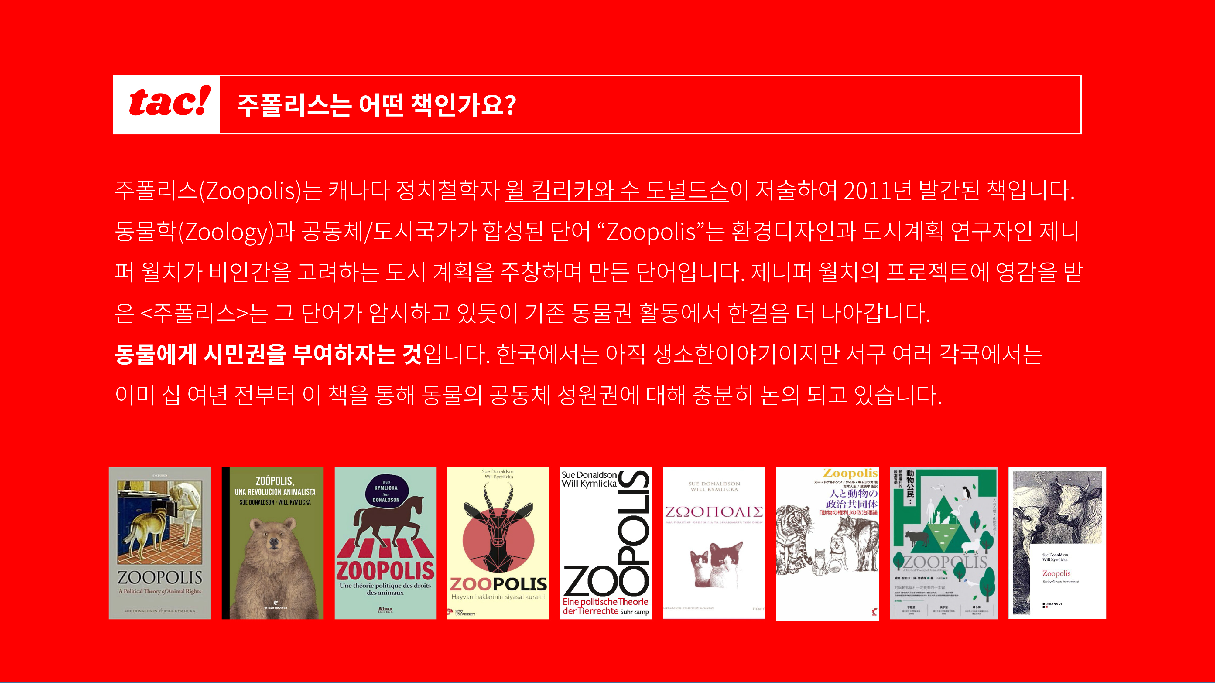 전 세계적으로 여성학, 인류학, 지리학 등 다양한 영역에서 동물에 대해 다루고 있습니다. 그러나 안타깝게도 한국은 그 상황이 예외입니다. 그나마 다행인 것은 동물권 에 대한 학술적이고 이론적인 논의가 조금씩 시작되는 분위기라는 것입니다. 이 물꼬를 트기 위한 작업으로 동물과 인간이 함께 사는 공동체, 주폴리스에 대한 번역, 출판을 진행하고자 합니다.